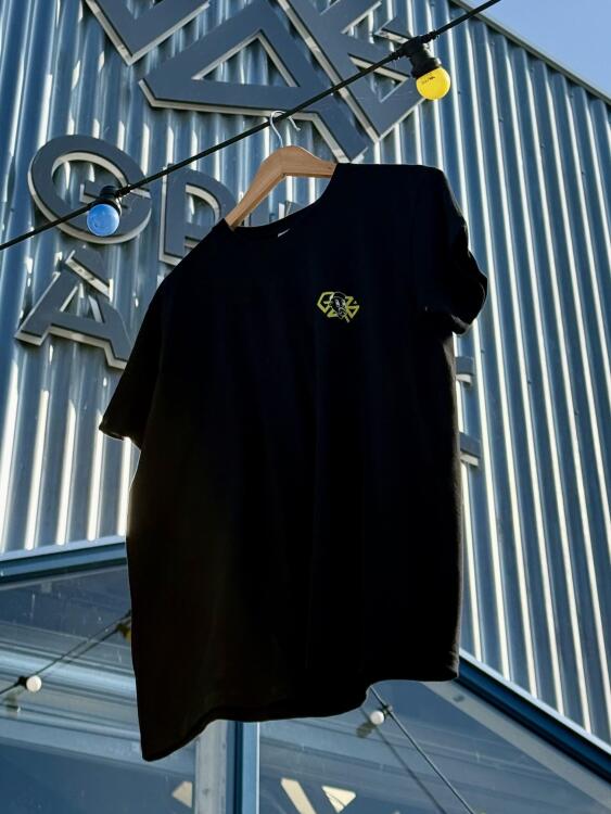 Un t-shirt noir, avec une illustration dans la thématique d'Halloween représentant un grimpeur qui chute... Le monstre de Grimp'A Bloc l'attend en bas ...